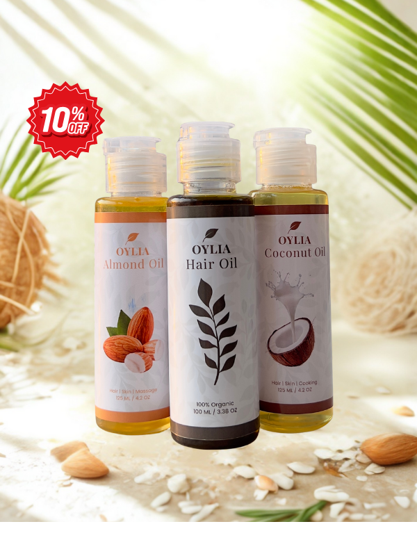 Discover the perfect harmony of nature with the Oylia Natural Care Trio, a premium 3-in-1 bundle featuring Oylia Almond Oil, Oylia Coconut Oil, and Oylia Herbal Hair Oil. Each bottle is crafted with care and purity to bring out the best of natural nourishment — for your hair, skin, and overall wellness.
